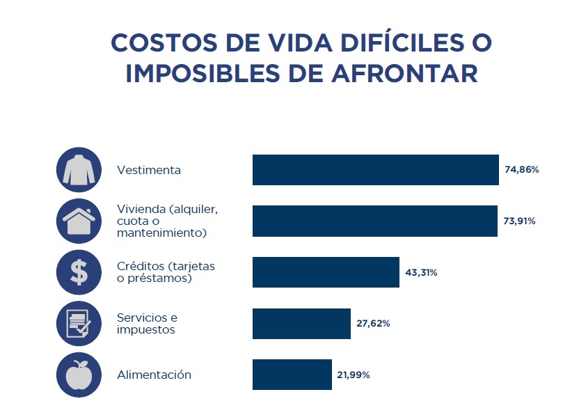 Aunque esta evolución puede resultar alentadora, otros datos que surgen del relevamiento ponen paños fríos al entusiasmo. Cuando se consultó sobre aquellos gastos difíciles o imposibles de afrontar, el 74,86% respondió “Vestimenta” y el 73,91% “Vivienda” (alquiler, cuota o mantenimiento). En contraposición, los números caen bastante para “Servicios e impuestos” (27,62%) y para “Alimentación” (21,99%). El director de Demokratia resalta que esto demuestra que los encuestados perciben que llegan a fin de mes, pero están trabajando para poder comer y pagar los impuestos.
