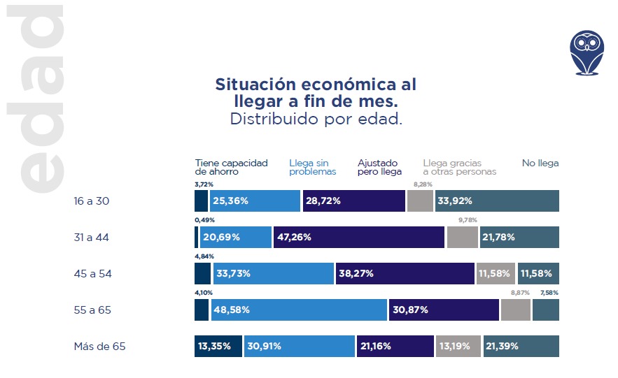 Las diferencias también existen según las edades. El grupo en el que mayor porcentaje de personas sienten que no llegan a fin de mes es el de 16 a 30, con 33,92%; seguido por el de 31 a 44, con 21,78%; el de más de 65, con 21,39%; el de 45 a 54, con 11,58%; y el de 55 a 65, con 7,58%.