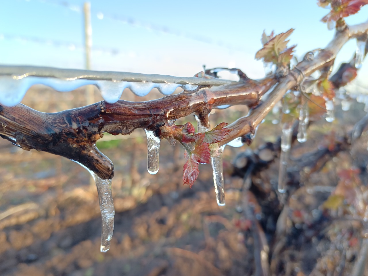 La afectación de las heladas en una finca depende, explica, de la distribución del aire frío, que generalmente se acumula en las depresiones del terreno, independientemente de que estén en la parte más alta o la más baja del predio. Además de la topografía, otro factor que modela la dinámica térmica en un viñedo es si el sistema de cultivo es en espaldero o parral, si hay frutales y si existe o no otra vegetación.