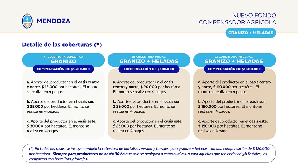 Cada oasis pagará una prima diferencial en la que el Centro y Norte son las que pagan menos, seguidos del Este, con mayor incidencia en el Sur que son los seguros más costosos en líneas generales. Cada una de estas coberturas incluye protección para hortalizas y forrajes, con una compensación de $120.000 por hectárea, lo que beneficia al mismo tiempo a los que combinan con vid o frutales, siempre para productores con hasta 30 hectáreas cultivadas.